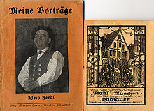 Beiheft: Gast- und Vergnügungsstätte Platzl München Dachauer. Seit 1906 tagt, Konzert u. Vorstellung der Dauchauer Direktion: Weiß Ferdl u. Eringer Seppl. Mit kleinem Dachauerisch-Deutschem Wörterverzeichnis; Lieder und schw/w Illustrationen. Auf der Rücksite Werbung für Hackerbräu, Ausschank im Platzl. Heft in befriedigendem Zustand, Außen angeschmutzt, fleckig, innen Wasserrand und leicht wellig; Beiheft (ca. 15 x 12 cm) gerade noch gut, außen leicht fleckig ca. 37 + 12 Seiten, ca. 19 x 13 cm,