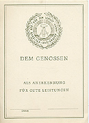 3672: Blanko-Urkunde: Dem Genossen als Anerkennung für Gute Leistungen. Original DDR