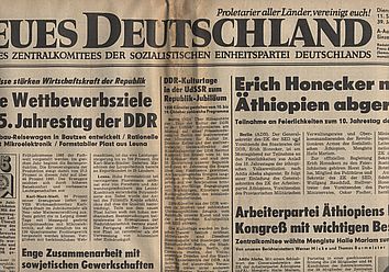Zeitungen, DDR, Wendezeit Inhalt u.a.: Erich Honecker in Äthopien, Schild 84 in der CSSR Zeitung, 6 Seiten, gut mit Spuren, gefaltet ca. 50 x 36 cm,