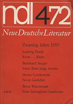 Inhalt u.a.: Zwanzig Jahre DSV, Ludwig Turek: Reise... Reise..., Bernhard Seeger: Vater Batti singt wieder, Heinz Czechowski: Neue Gedichte, Berta Waterstradt: Eine belanglose Geschichte Heft, 173 Seiten, gut mit Spuren ca. 20 x 14 cm,