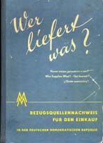Bezugsquellennachweis für den Einkauf in der DDR, 30. Ausgabe 1967. Inhalt u.a.: Bezugsquellen nach Warengruppen (u.a. Chemie, Kosmetik, Pharmazie, Maschinenbau, Elektrotechnik, Foto, Kino, Optik, Fahrzeug-, Flugzeug- und Schiffbau, Haus- und Wirtschaftsgeräte, Glas, Keramik, Porzellan, Nahrungs- und Genußmittelindustrie). Zahlreiche z.T. farbige ganzseitige Werbeanzeigen z.B. ZEKIWA, GERMED, mifa, RFT, Wittol, GERANA Pappeinband mit Leinenrücken, ca. 1200 Seiten, zahllose Fotos und Abbildungen, Guter Zustand, Einband bestoßen ca. 30 x 21 cm,